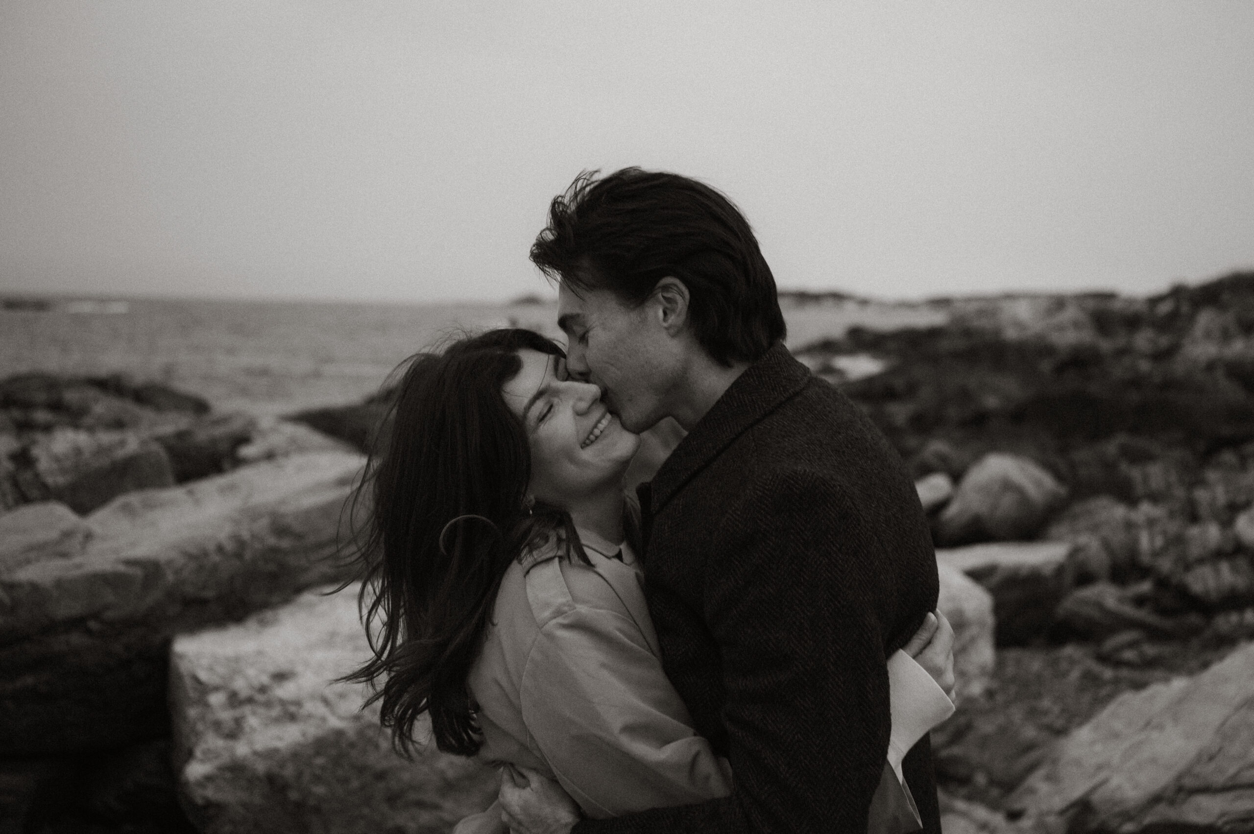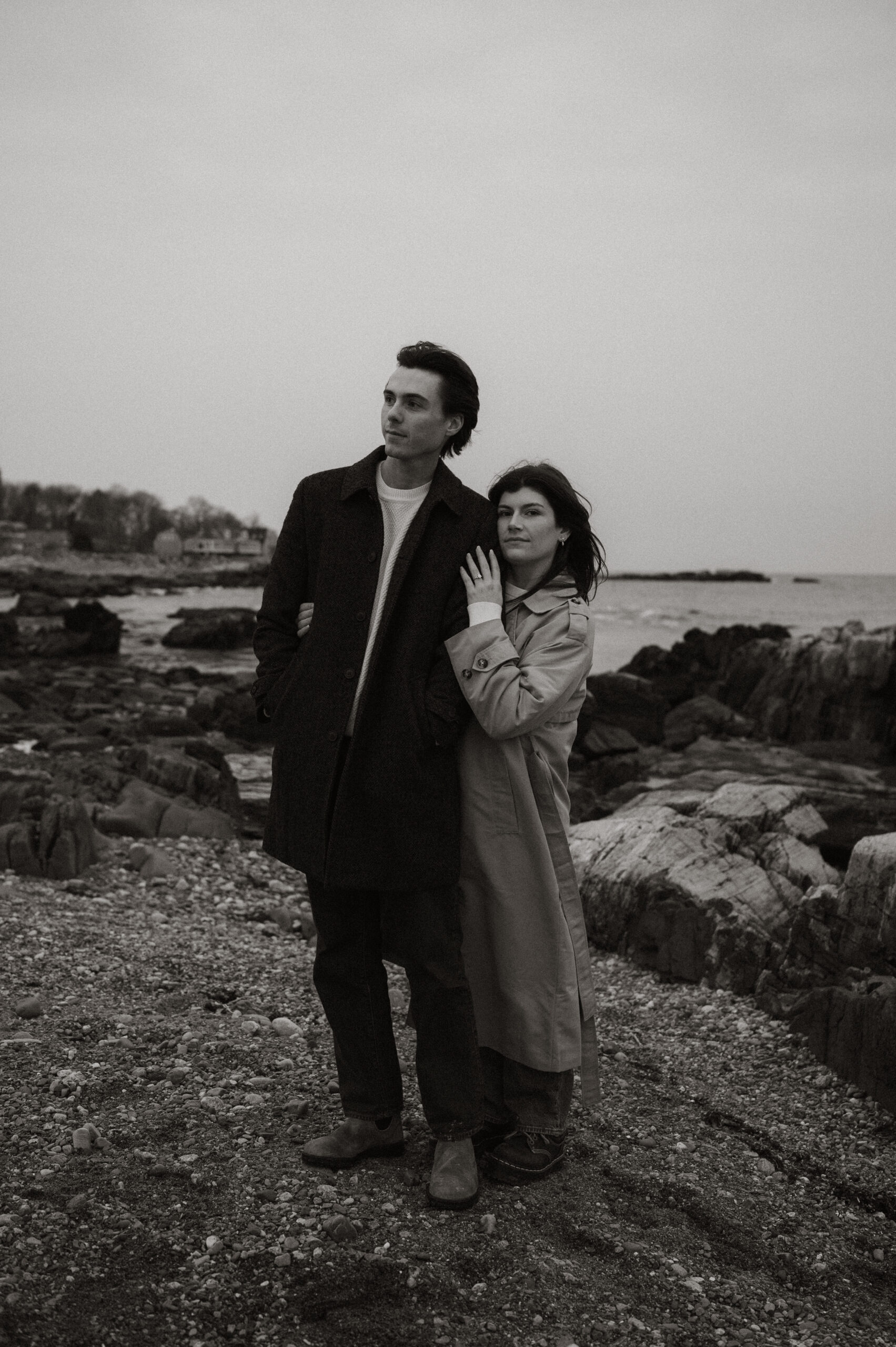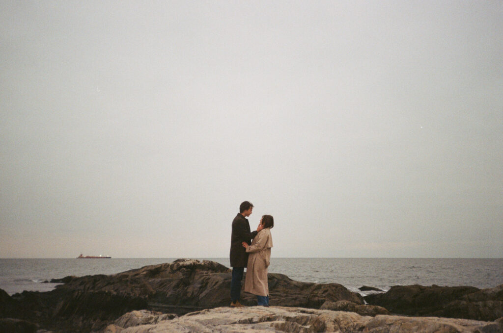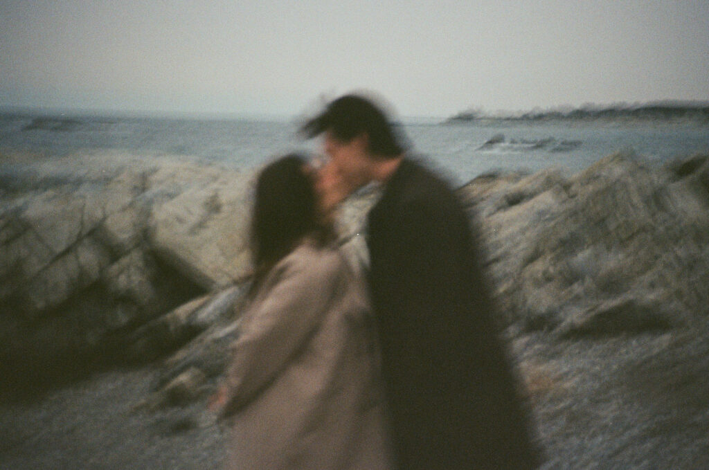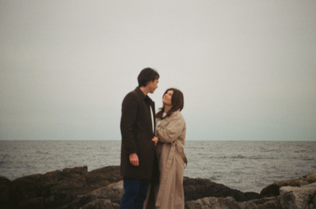 Cinematic engagement photography New England Film-inspired engagement photos New England Story-driven wedding photography New England Editorial coastal engagement photography Moody cinematic engagement session Timeless New England engagement photos Romantic cinematic wedding photography
